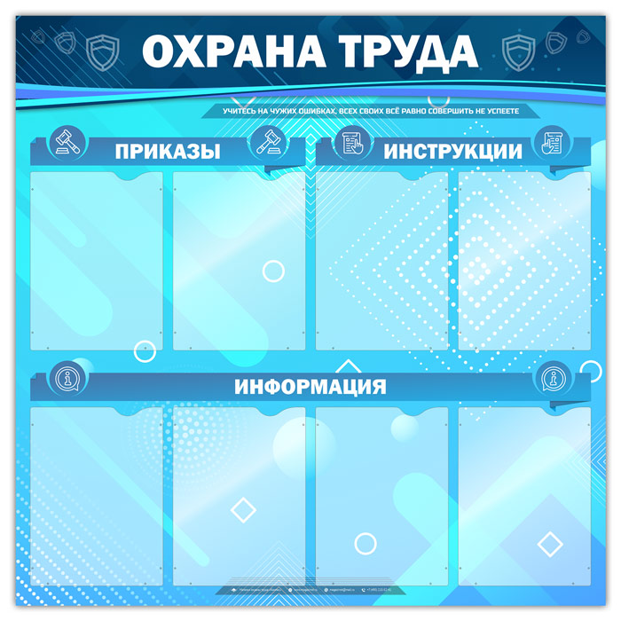 Стенд «Охрана труда» – стенд с плоскими карманами А4 формата для самостоятельной комплектации: два кармана – для размещения приказов, два кармана – для инструкций по охране труда и четыре кармана – под информацию…
