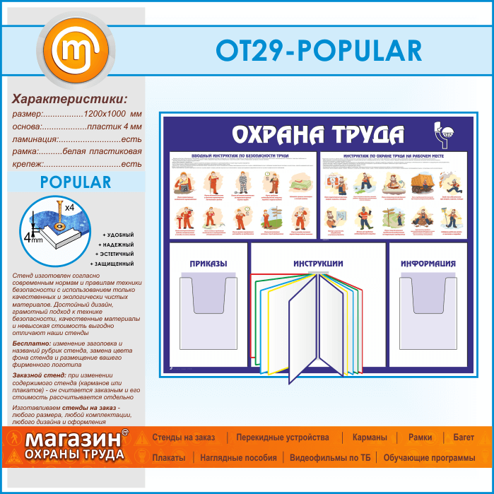Стенд «Охрана труда» – яркий стенд на котором размещена полезная информация о вводном инструктаже по безопасности труда и инструктаж по охране труда на рабочем месте. Для самостоятельного размещения информации на стенде предусмотрено 2 объемных А4 кармана под приказы и информацию и одна перекидная система А4 формата на 10 рамок под инструкции…