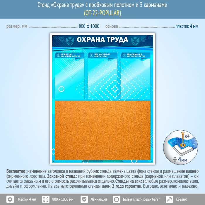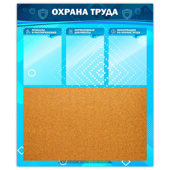 Стенд «Охрана труда» – это пробковое полотно А2 формата для быстрой смены информации любого формата и 3 плоских карманов А4 формата для приказов и распоряжений, нормативных документов и информации по охране труда…