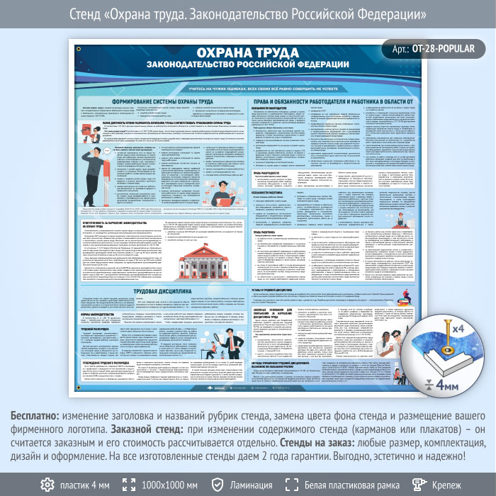 Стенд «Охрана труда. Законодательство Российской Федерации» содержит информацию про формирование системы ОТ, о том какие документы нужно разработать, чтобы соответствовать требованиям ОТ, об ответственности за нарушение законодательства в данной сфере. Также здесь вы найдете права и обязанности работодателя и работника в области ОТ, информацию о трудовой дисциплине - нормы законодательства, трудовой распорядок, уставы о трудовой дисциплине, законные основания для увольнения за ее нарушение и методы управления трудовой дисциплиной.