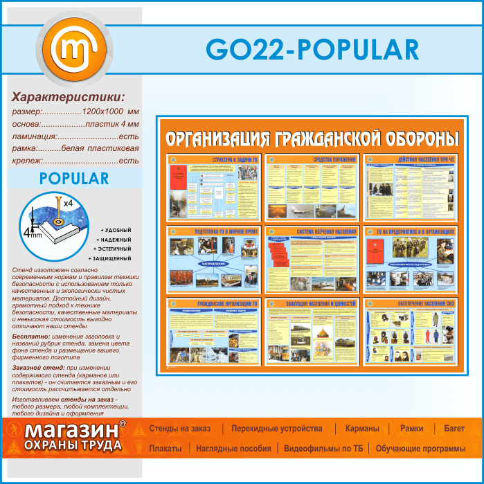 Стенд «Организация гражданской обороны» – полезная информация о структуре и задачах ГО, средствах поражения, действиях населения при ЧС, подготовка ГО в мирное время, система обучения населения, ГО на предприятиях и в организациях, гражданские организации ГО, эвакуация населения и ценностей, обеспечение населения СИЗ…