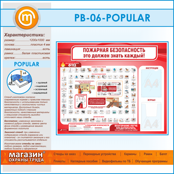 Стенд «Пожарная безопасность. Это должен знать каждый» – качественная информация о противопожарной защите: наглядно проиллюстрированы причины пожаров; правила эвакуации – что делать, если начался пожар; как организовать рабочее место и не допустить пожара, приведены основные знаки пожарной безопасности, на стенде есть один плоский карман А4 формата для инструкций и один объемный карман А4 формата для журнала по ПБ…