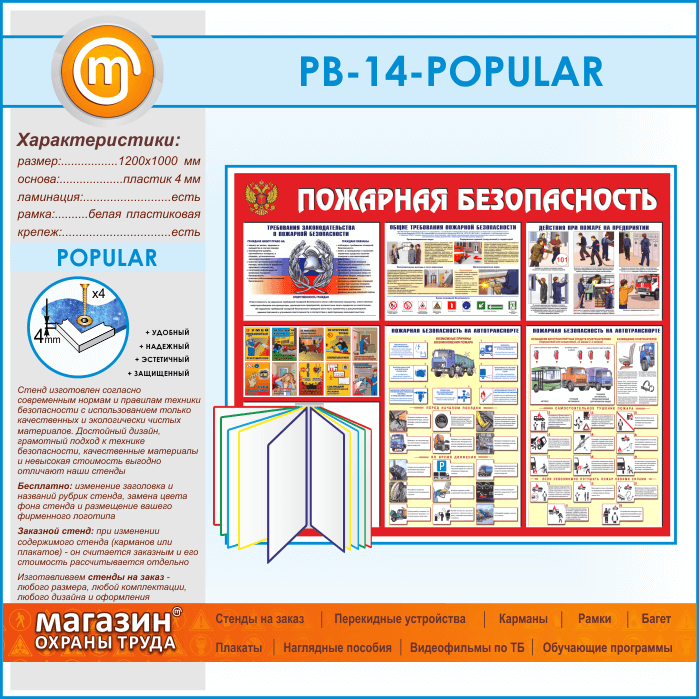 Стенд «Пожарная безопасность на автотранспорте» – это наглядная информация с требованиями законодательства и общими требованиями пожарной безопасности. Приведены примеры действий при пожаре и основные причины возгораний. На стенде качественно проиллюстрирована пожарная безопасность на автотранспорте: возможные причины возникновения пожара, профилактика пожаров перед поездкой и во время движения, оснащение автомобиля средствами пожаротушения, самостоятельное тушение пожара и что делать, если невозможно потушить пожар своими силами. На стенде установлена перекидная система на 10 рамок – для самостоятельного размещения информации – 20 страниц А4 формата