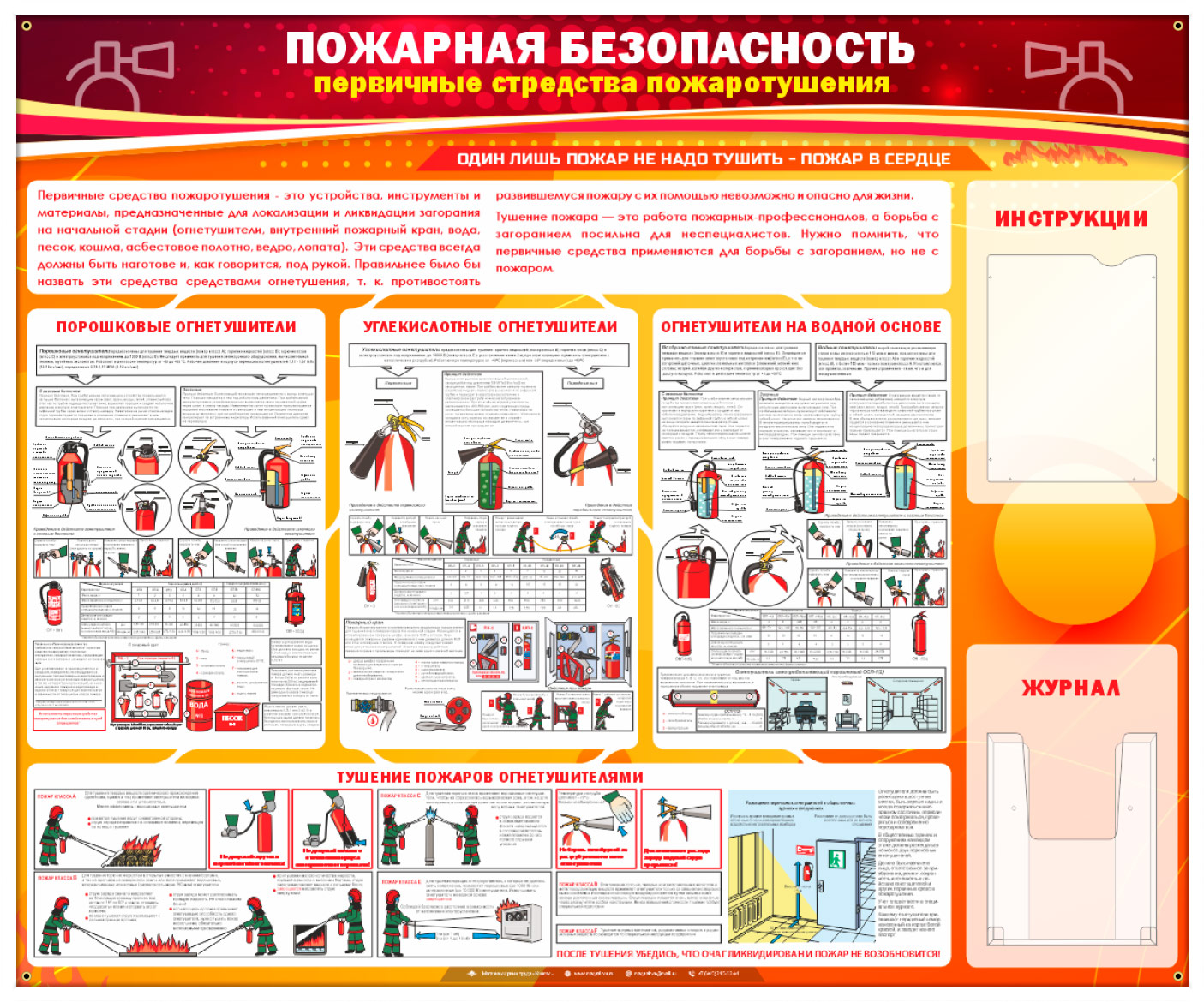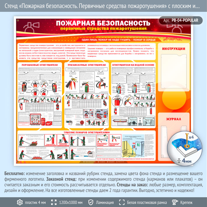Стенд «Пожарная безопасность. Первичные средства пожаротушения» – это яркое пособие для изучения первичных средств пожаротушения: порошковые огнетушители, углекислотные и огнетушители на водной основе – их устройство, хранение и использование, а также примеры как правильно использовать огнетушители во время пожара. На стенде установлено два кармана А4 формата: плоский – для инструкций и объемный – для журнала…