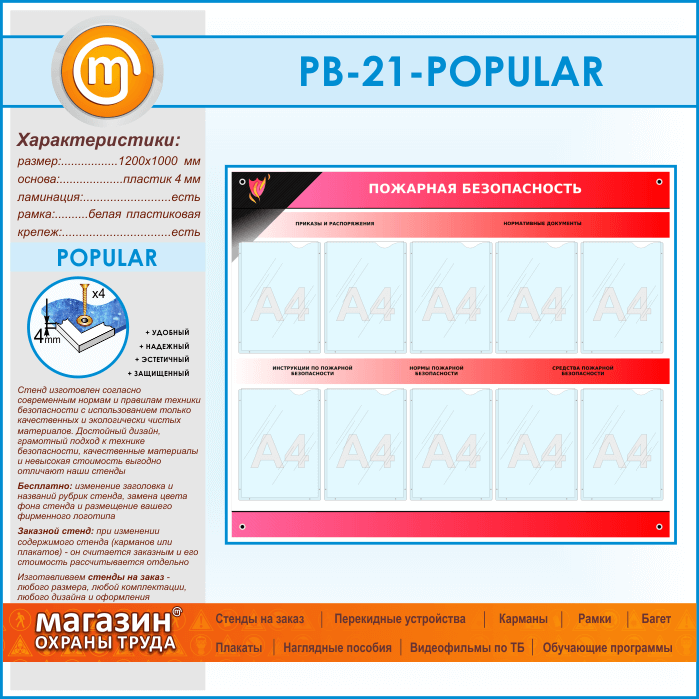 Стенд по пожарной безопасности с карманами предназначен для самостоятельного расположения необходимой информации по пожарной безопасности на предприятии – это 10 плоских качественных карманов А4 формата, выполненных из оргстекла на дистанционных держателях, предотвращающих попадание мусора в карманы и скапливания пыли. Над карманами на стенде расположены следующие рубрики: приказы и распоряжения, нормативные документы, инструкции по пожарной безопасности, нормы пожарной безопасности и средства пожарной безопасности