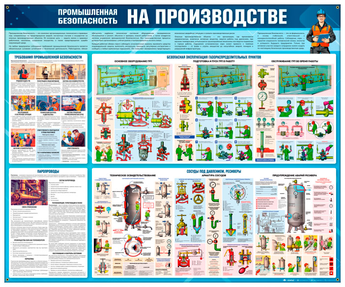Стенд «Промышленная безопасность на производстве» (TM-46) посвящён вопросам обеспечения промышленной безопасности при работе с опасным оборудованием и системами на производственных объектах. На плакатах представлены требования промышленной безопасности, устройство и обслуживание сосудов под давлением и газораспределительных пунктов, правила эксплуатации паропроводов, методы технического освидетельствования и предупреждения аварий. Особое внимание уделено визуальным схемам и пошаговым инструкциям по безопасной эксплуатации оборудования. Стенд помогает формировать культуру безопасности на предприятии, снижать производственные риски и предупреждать аварийные ситуации.