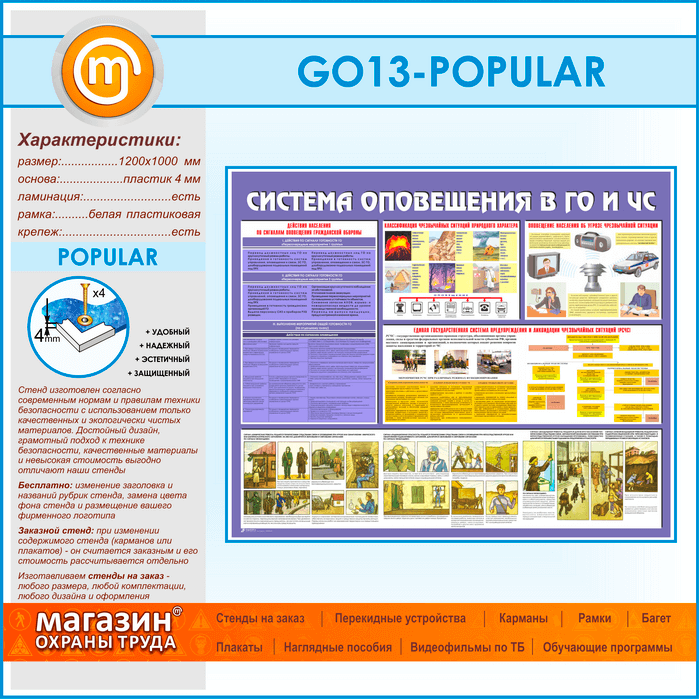 Стенд «Система оповещения в ГО и ЧС» – на этом стенде отображена система действий населения по сигналам оповещения гражданской обороны, классификация чрезвычайных ситуаций природного характера, оповещение населения об угрозе ЧС, единая государственная система предупреждения и ликвидации чрезвычайных ситуаций и эвакуация населения при объявлении о чрезвычайной ситуации…
