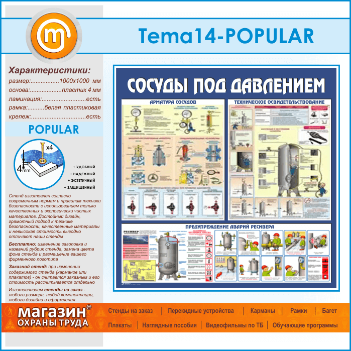 Стенд «Сосуды под давлением» – это иллюстрированное устройство сосудов: арматура, контрольно-измерительные приборы, предохранительные устройства; наглядное техническое освидетельствование сосудов: подготовка, наружный и внутренний осмотр, гидравлические испытания; предупреждение аварий ресивера: аварийная остановка, потенциальные опасности, возможные неисправности…