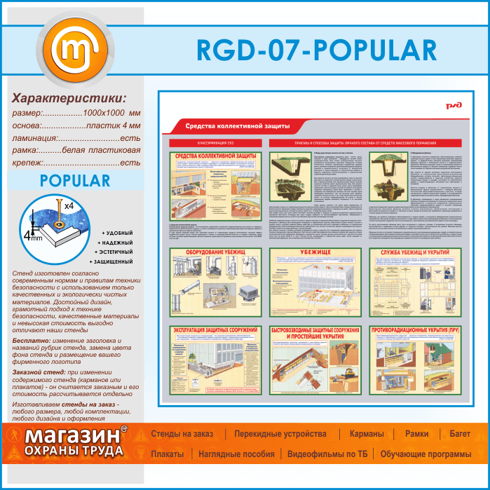 Стенд «Средства коллективной защиты» – это классификация СИЗ и приемы и способы защиты личного состава от средств массового поражения. На стенде размещены плакаты: оборудование убежищ и эксплуатация защитных сооружений, быстровозводимые защитные сооружения и простейшие укрытия, противорадиационные укрытия и убежища, служба убежищ и укрытий и другие примеры средств коллективной защиты