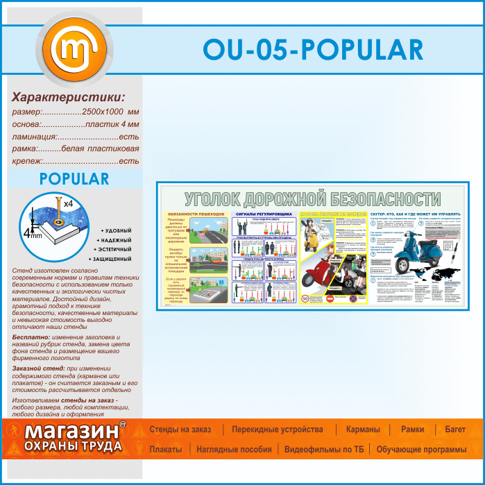 Стенд «Уголок дорожной безопасности» – это каждодневное напоминание для ребят старшего возраста об основных правилах поведения на проезжей части для пешеходов – правила и обязанности. Данный стенд рассчитан на детей, которые являются не только пешеходами, но и становятся участниками дорожного движения – на скутере, мопеде или велосипеде. Этот стенд расскажет подросткам о сигналах регулировщика, об основных правилах управления мопедом или скутером – кто, как и где может им управлять, что разрешается, а что запрещено