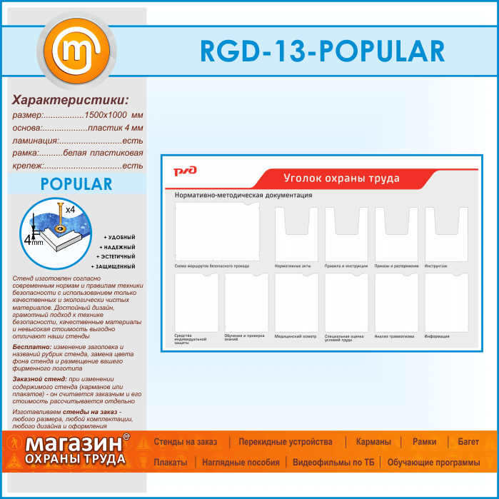 Представляем стенд для сотрудников железной дороги РЖД – Уголок охраны труда – это стенд для самостоятельного размещения нормативно-методической документации: плоский А3 альбомный карман для схемы маршрутов безопасного прохода, четыре объемных А4 формата для нормативных актов, правил и инструкций, приказов и распоряжений и инструктажа и шесть плоских А4 карманов для размещения информации по средствам индивидуальной защите, обучению и проверке, медицинскому осмотру, специальным оценкам условий труда, анализу травматизма. По желанию заказчика рубрики на стенде могут быть заменены