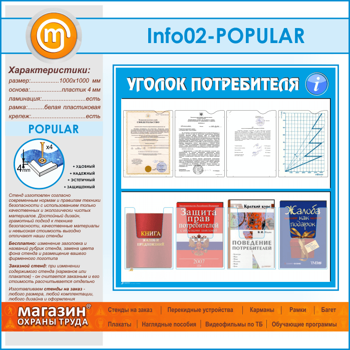 Стенд «Уголок потребителя» состоит из 4 плоских карманов А4 формата книжного (вертикального) расположения для размещения информации покупателю, а также из 4-х объемных карманов А4 формата для размещения книги жалоб и предложений, брошюры для покупателей и потребителей…