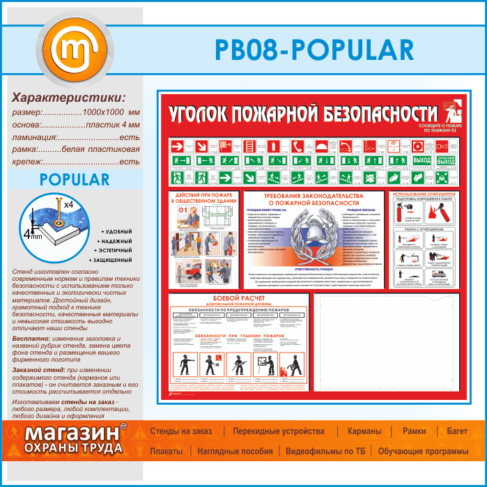 Стенд «Уголок пожарной безопасности» – небольшой стенд с самой необходимой информацией по ПБ: знаки пожарной безопасности и эвакуационные знаки, действия при пожаре в общественном здании, требования законодательства о пожарной безопасности, использование огнетушителя, боевой расчет и плоский карман А3 формата под план эвакуации…