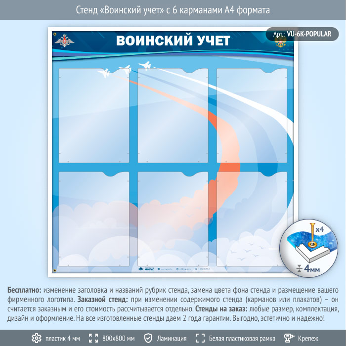 Стенд «Воинский учет» с 6 карманами А4 формата (VU-6K) предназначен для самостоятельного размещения информации – от документов, приказов и инструкций до рекламы... Часто на таких стендах размещают контактные данные, образцы заполняемых бланков, график работы, порядок приема документов в организации и прочее.