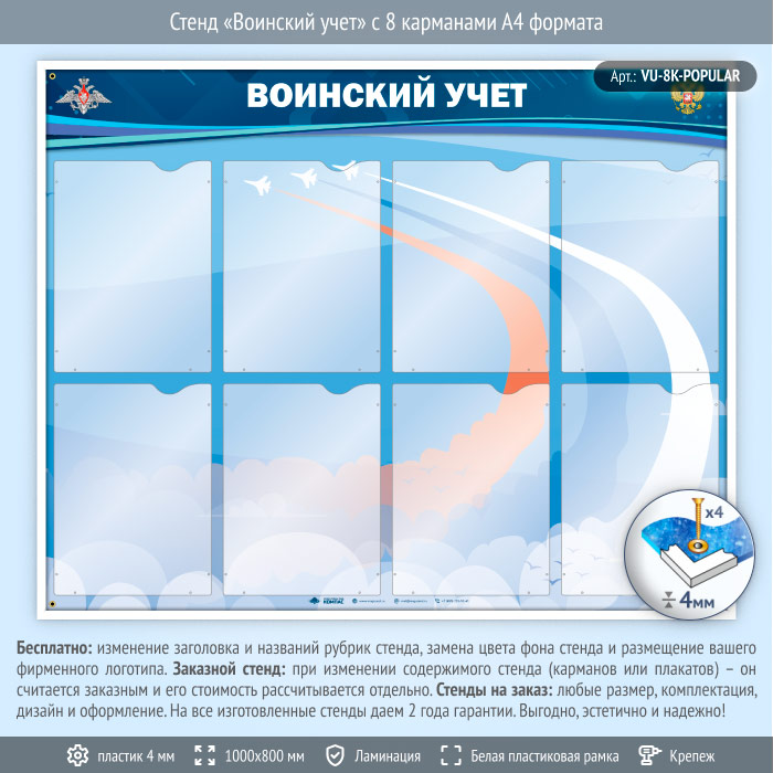 Стенд «Воинский учет» с 8 карманами А4 формата (VU-8K)