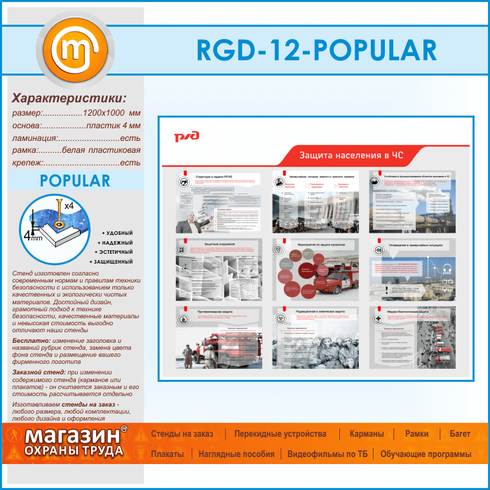 Стенд по защите населения в чрезвычайных ситуациях – это основная информация для сотрудников РЖД в сфере ГО и ЧС: структура и задачи РСЧС, чрезвычайные ситуации мирного и военного времени, устойчивость функционирования объектов экономики в ЧС, защитные сооружения, мероприятия по защите населения, оповещение в чрезвычайных ситуациях. Также на стенде присутствуют плакаты по противопожарной защите, радиационной и химической защите и медико-биологической защите
