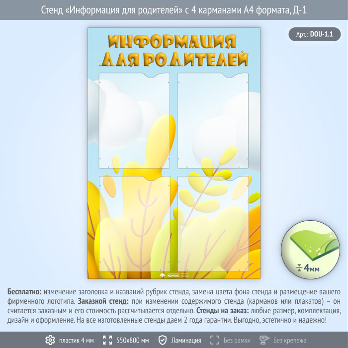 Стенд «Информация для родителей» с 4 карманами А4 формата (DOU-1.1)