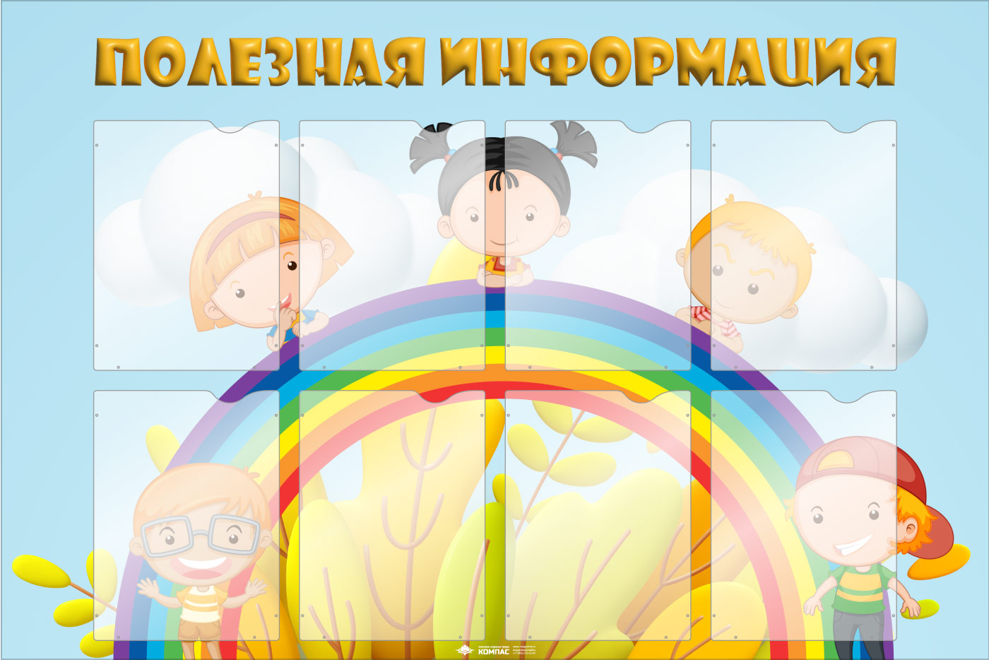 Стенд «Полезная информация» с 8 карманами А4 формата (DOU-1.7) имеет яркий, привлекательный дизайн, отлично подходящий для детского сада.