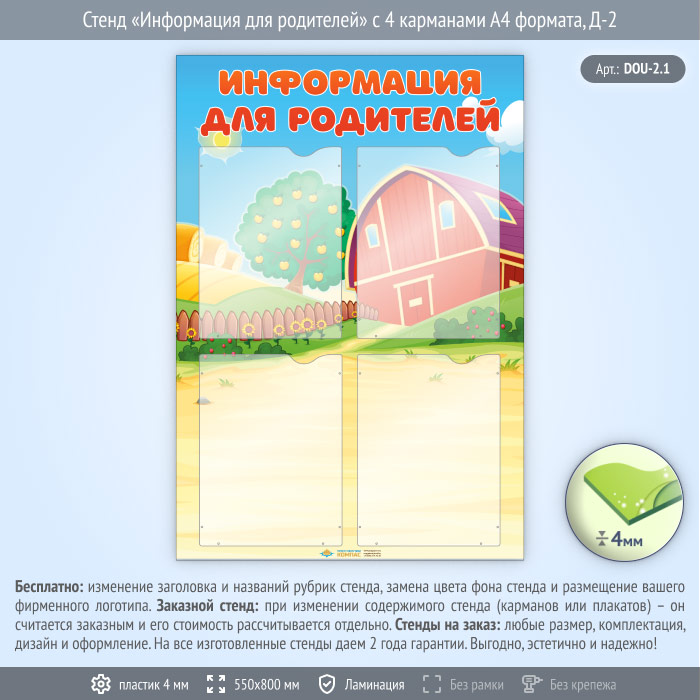 Стенд «Информация для родителей» с 4 карманами А4 формата (DOU-2.1)