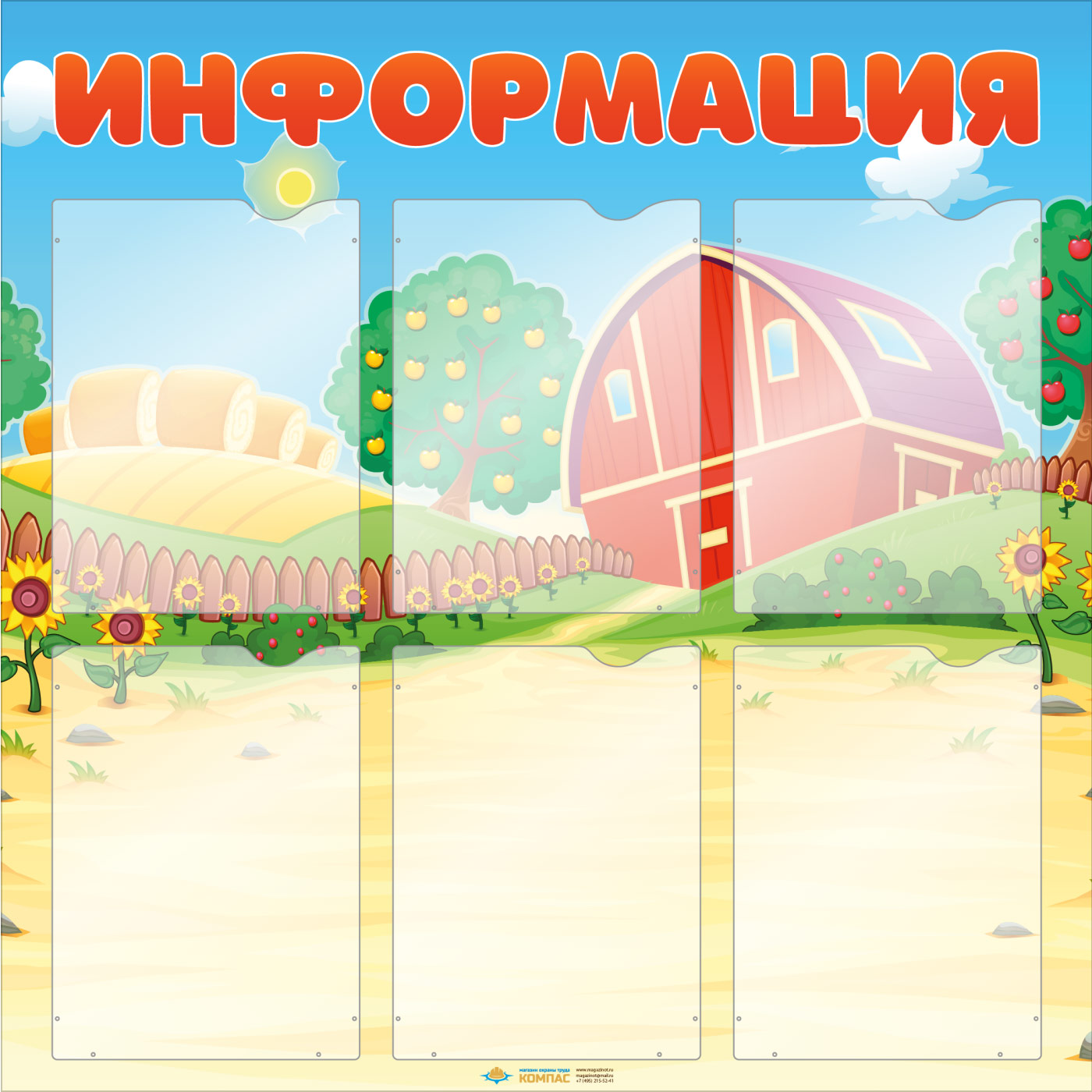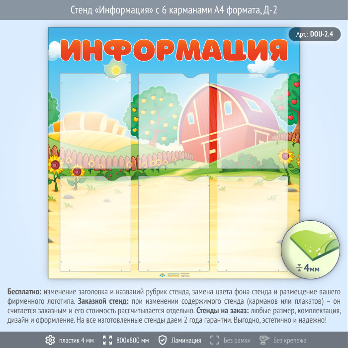 Стенд «Информация» с 6 карманами А4 формата (DOU-2.4) имеет яркий, привлекательный дизайн, отлично подходящий для детского сада.