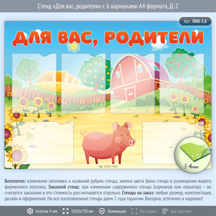 Стенд «Для вас, родители» с 6 карманами А4 формата (DOU-2.6)