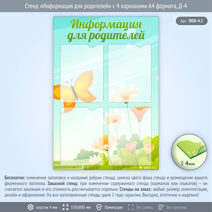 Стенд «Информация для родителей» с 4 карманами А4 формата (DOU-4.1)