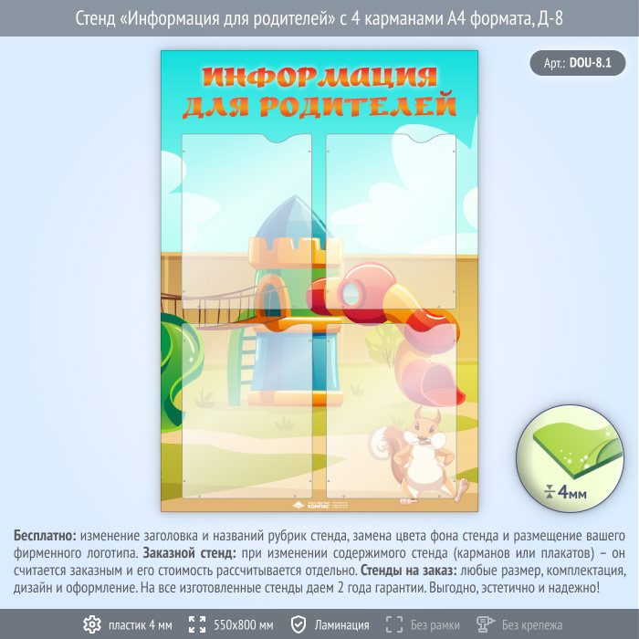 Стенд «Информация для родителей» с 4 карманами А4 формата (DOU-8.1)