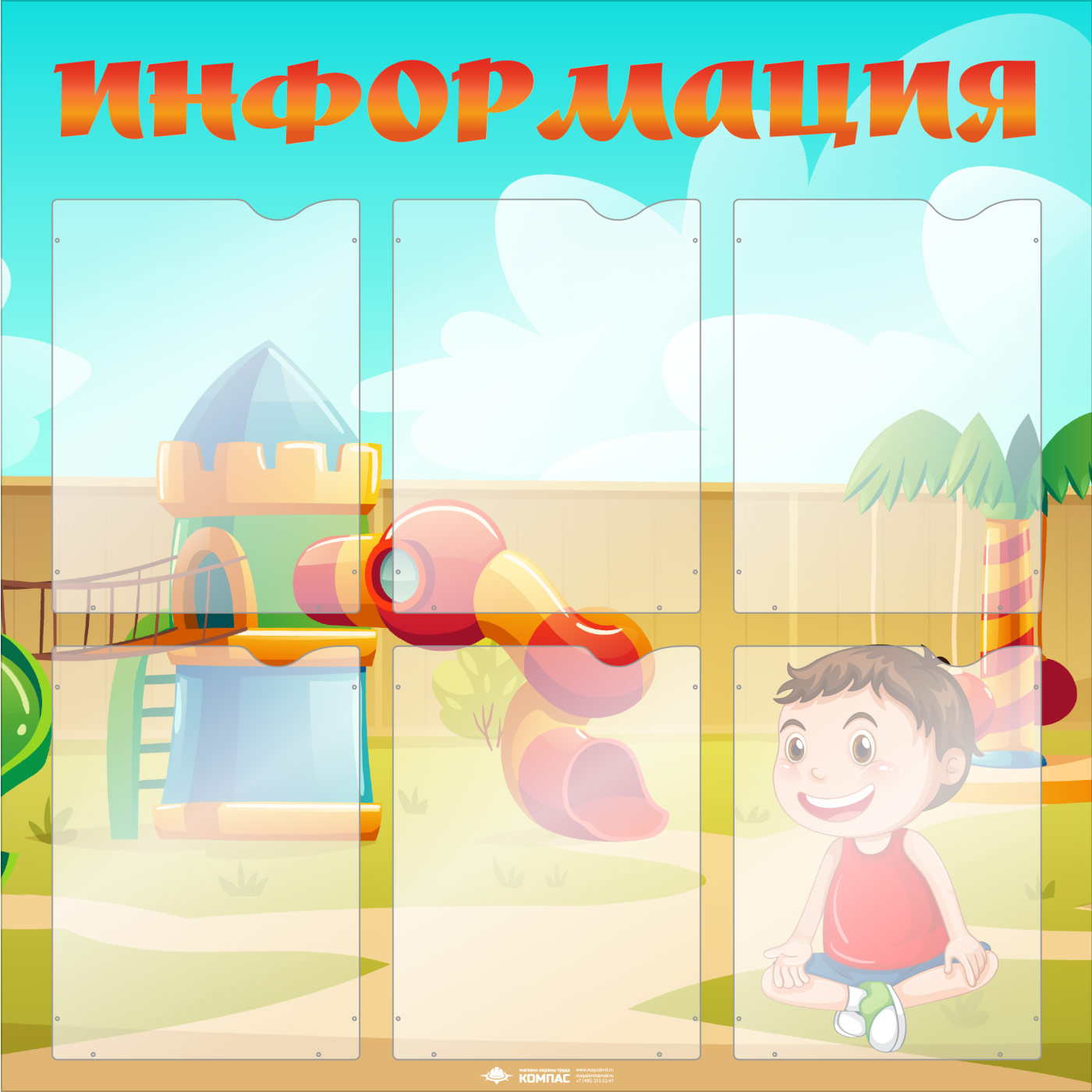 Стенд «Информация» с 6 карманами А4 формата (DOU-8.4) имеет яркий, привлекательный дизайн, отлично подходящий для детского сада.