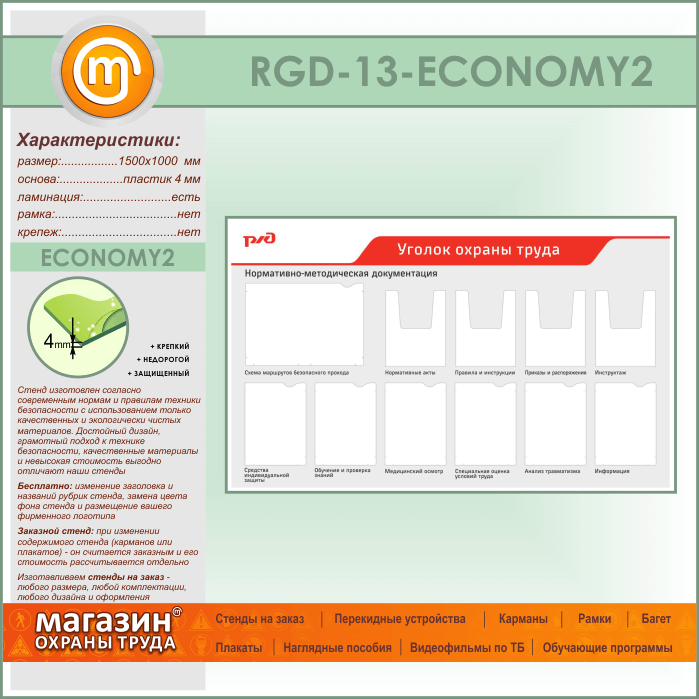 Представляем стенд для сотрудников железной дороги РЖД – Уголок охраны труда – это стенд для самостоятельного размещения нормативно-методической документации: плоский А3 альбомный карман для схемы маршрутов безопасного прохода, четыре объемных А4 формата для нормативных актов, правил и инструкций, приказов и распоряжений и инструктажа и шесть плоских А4 карманов для размещения информации по средствам индивидуальной защите, обучению и проверке, медицинскому осмотру, специальным оценкам условий труда, анализу травматизма. По желанию заказчика рубрики на стенде могут быть заменены