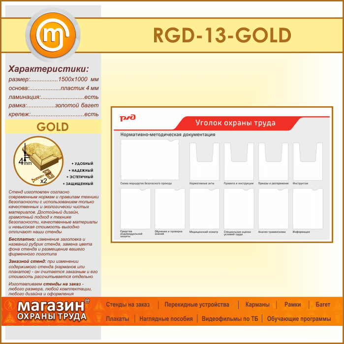 Стенд «Уголок охраны труда» с 1 плоским карманом А3 формата, 6 плоскими и 4 объемными карманами А4 формата (RGD-13-GOLD)