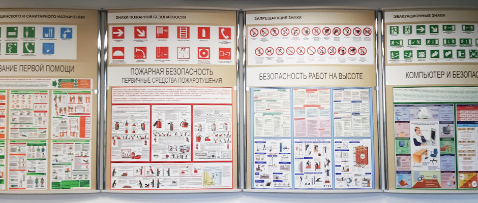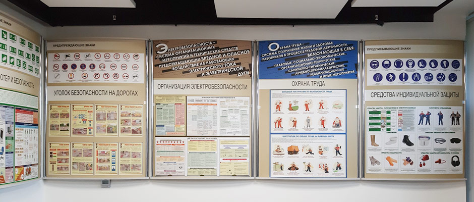 Стенды по охране труда и технике безопасности можно встретить повсеместно. Широкое распространение они получили из-за удобства в размещении информации — с ними не нужно придумывать, как прикрепить к стене печатные материалы, карманы и перекидные системы, — теперь достаточно установить стенд, уже содержащий все необходимое. Кроме того, при таком подходе значительно улучшается восприятие материла. Стенд может содержать как служебную информацию (например, правила ТБ, инструкции и пр.), так и информацию общего или учебно-развлекательного характера (чаще всего это стенды для образовательных учреждений)