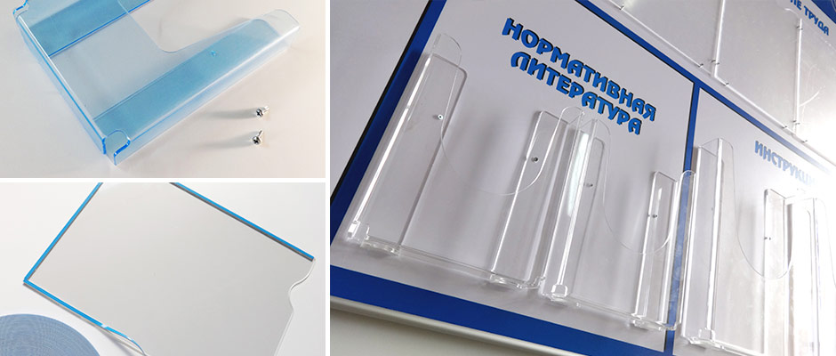 Помимо постоянной информации, которую мы печатаем непосредственно на поверхности стенда, можно использовать и сменную — в виде листов, журналов, плакатов и даже книг. В большинстве случаев этого будет вполне достаточно для организации элементарной безопасности или предотвращения несчастных случаев, как на производстве или транспорте, так и дома