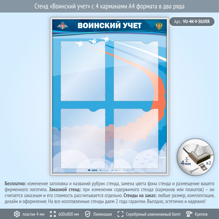 Стенд «Воинский учет» с 4 карманами А4 формата в два ряда (VU-4K-V-SILVER)