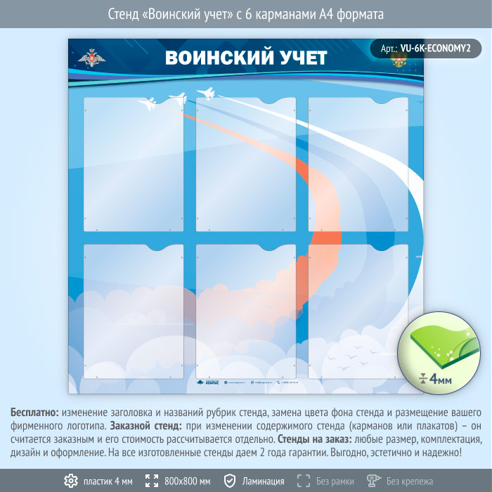 Стенд «Воинский учет» с 6 карманами А4 формата (VU-6K-ECONOMY2)