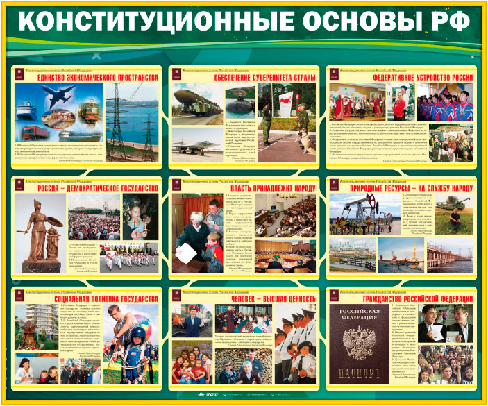 Стенд «Конституционные основы Российской Федерации» (VU-01) предназначен для знакомства с основами констинуции РФ. Что РФ - демократическое государство, что его высшей целью является человек, как обеспечивается народовластие в стране, охрана суверенитета, как осуществляется федеративное устройство РФ, кто может быть гражданином РФ, что лежит в основе социальной политики государства, что собой представляет система государственной власти в стране.