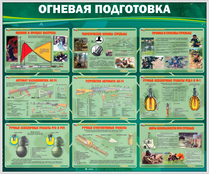 Стенд «Огневая подготовка» (VU-02) разработан в соответствии с Федеральным законом «О воинской обязанности и военной службе», Положением о подготовке граждан Российской Федерации к военной службе, Концепцией патриотического воспитания граждан РФ, тематическим планом раздела ОБЖ «Основы военной службы». На стенде раскрываются теоретические основы стрельбы, явление и процесс выстрела, приемы и способы стрельбы, предназначение и устройство РПК-74 и АК-74, ручных осколочных гранат РГД-5 и Ф-1, а также гранат РГО и РГН, меры безопасности при стрельбе.