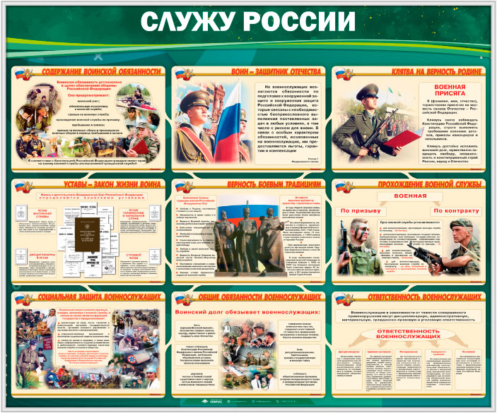 Стенд «Служу России» (VU-03) раскрывает содержание воинской обязанности, рассказывает об уставах, верности боевым традициям и многом другом.