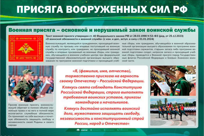Стенд «Присяга Вооруженных Сил РФ» (VU-04) содержит текст военной присяги ВС РФ. Данный текст утвержден ст. 40 ФЗ РФ от 28.03.1998 N 53-ФЗ (ред. от 25.12.2023) «О воинской обязанности и военной службе» (с изм. и доп., вступ. в силу с 01.01.2024)