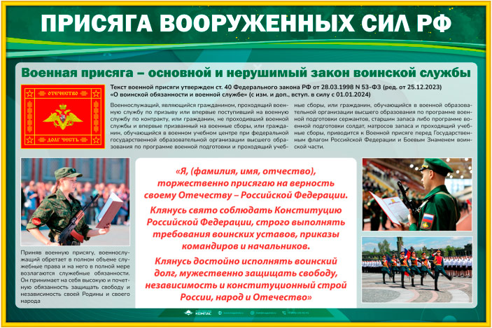 Стенд «Присяга Вооруженных Сил РФ» (VU-04) содержит текст военной присяги ВС РФ. Данный текст утвержден ст. 40 ФЗ РФ от 28.03.1998 N 53-ФЗ (ред. от 25.12.2023) «О воинской обязанности и военной службе» (с изм. и доп., вступ. в силу с 01.01.2024)