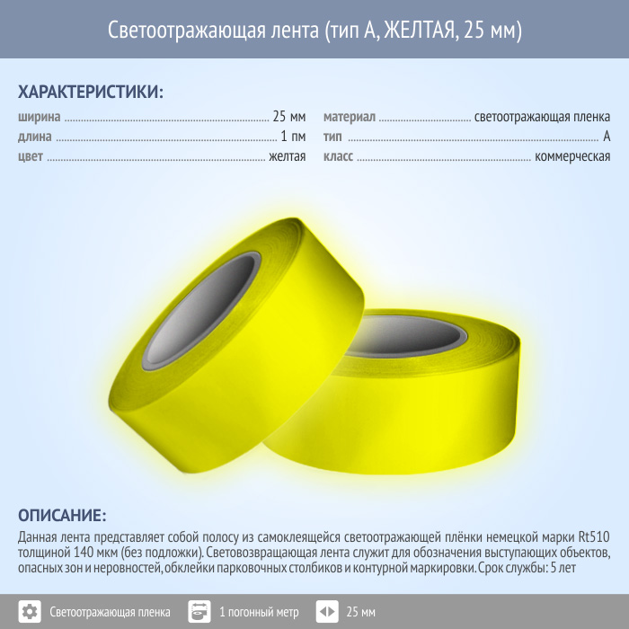 Световозвращающая лента шириной 25 мм представляет собой полосу из ЖЕЛТОЙ самоклеящейся светоотражающей плёнки ТМ3100. Служит для обозначения выступающих объектов, опасных зон и неровностей, обклейки парковочных столбиков и контурной маркировки