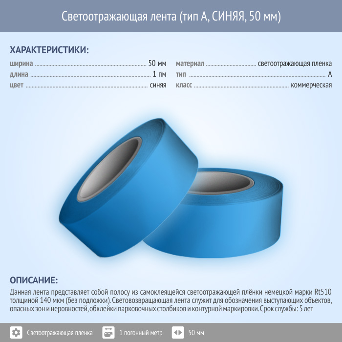 Световозвращающая лента шириной 50 мм представляет собой полосу из СИНЕЙ самоклеящейся светоотражающей плёнки ТМ3100. Служит для обозначения выступающих объектов, опасных зон и неровностей, обклейки парковочных столбиков и контурной маркировки