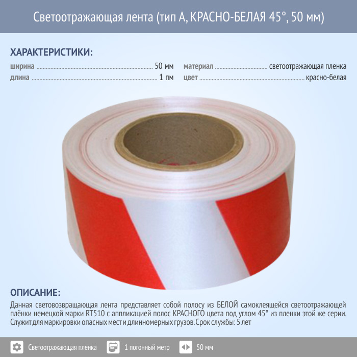 Световозвращающая лента шириной 50 мм представляет собой полосу из БЕЛОЙ самоклеящейся светоотражающей плёнки ТМ3100 с аппликацией полос КРАСНОГО цвета под углом 45° из пленки этой же серии. Служит для маркировки опасных мест и длинномерных грузов