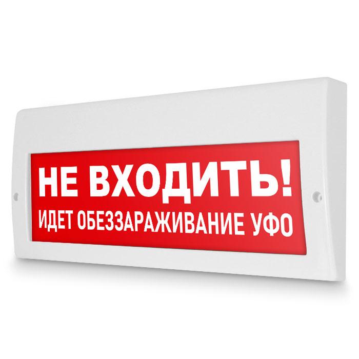 Световое табло «Не входить! Идет обеззараживание УФО». Плоское световое табло Молния (220В РИП) с резервным источником питания служит для обозначения эвакуационных путей в помещениях различного назначения. Конструкция светового указателя дает возможность менять надпись. Световой блок светового указателя выполнен на светодиодах и не требует текущего обслуживания