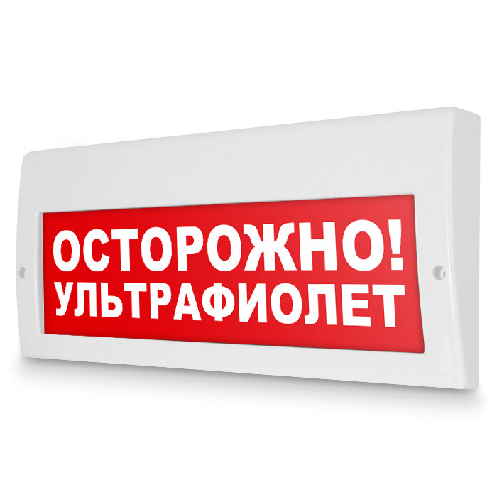 Световое табло «Осторожно! Ультрафиолет». Плоское световое табло Молния (220В РИП) с резервным источником питания служит для обозначения эвакуационных путей в помещениях различного назначения. Конструкция светового указателя дает возможность менять надпись. Световой блок светового указателя выполнен на светодиодах и не требует текущего обслуживания