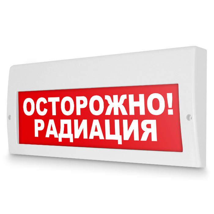 Световое табло «Осторожно! Радиация». Плоское световое табло Молния (220В РИП) с резервным источником питания служит для обозначения эвакуационных путей в помещениях различного назначения. Конструкция светового указателя дает возможность менять надпись. Световой блок светового указателя выполнен на светодиодах и не требует текущего обслуживания
