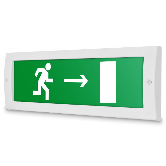 Световое табло «Направление к эвакуационному выходу направо». Плоское световое табло Молния (12В) служит для обозначения эвакуационных путей в помещениях различного назначения. Данный светоуказатель имеет минимальное энергопотребление. Световой блок светового указателя выполнен на светодиодах и не требует текущего обслуживания
