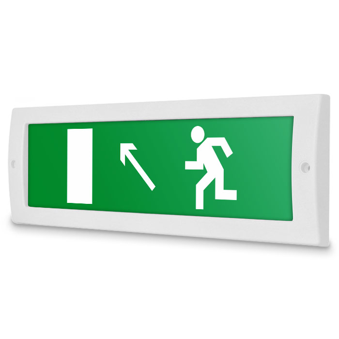Световое табло «Направление к эвакуационному выходу налево вверх». Плоское световое табло Молния (12В) служит для обозначения эвакуационных путей в помещениях различного назначения. Данный светоуказатель имеет минимальное энергопотребление. Световой блок светового указателя выполнен на светодиодах и не требует текущего обслуживания