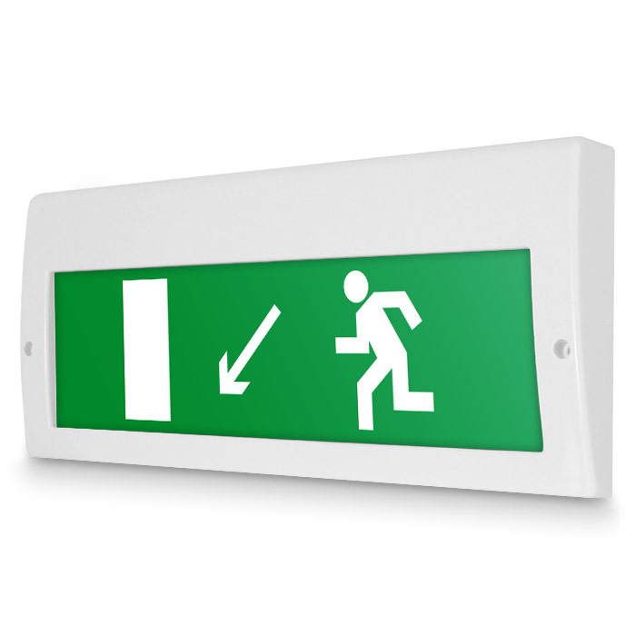 Световое табло «Направление к эвакуационному выходу налево вниз». Плоское световое табло Молния (220В РИП) с резервным источником питания служит для обозначения эвакуационных путей в помещениях различного назначения. Конструкция светового указателя дает возможность менять надпись. Световой блок светового указателя выполнен на светодиодах и не требует текущего обслуживания