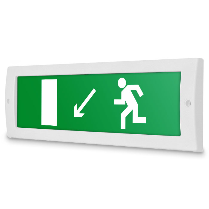 Световое табло «Направление к эвакуационному выходу налево вниз». Плоское световое табло Молния (12В) служит для обозначения эвакуационных путей в помещениях различного назначения. Данный светоуказатель имеет минимальное энергопотребление. Световой блок светового указателя выполнен на светодиодах и не требует текущего обслуживания