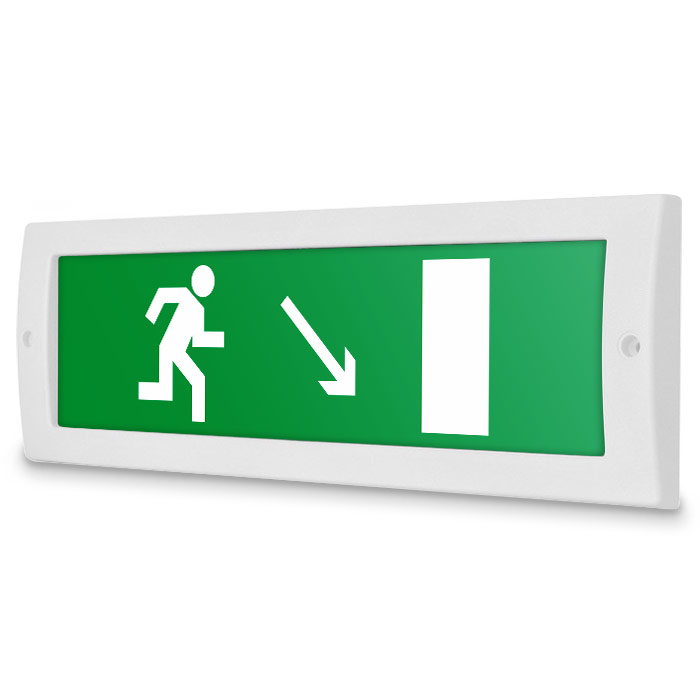 Световое табло «Направление к эвакуационному выходу направо вниз». Плоское световое табло Молния (12В) служит для обозначения эвакуационных путей в помещениях различного назначения. Данный светоуказатель имеет минимальное энергопотребление. Световой блок светового указателя выполнен на светодиодах и не требует текущего обслуживания